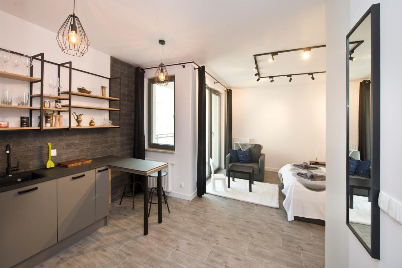 Apartament typu studio. Featuring 1 bedroom, this apartment offers 1 bathroom with a shower, a seating area and terraceyou can relax. In the kitchen, guests will find a stovetop, a refrigerator, a dishwasher and kitchenware. The apartment offers a washing machine, soundproof walls, a tea and coffee maker, a flat-screen TV with streaming services, as well as city views. The unit has 2 beds. Apartament - 3 osobowy. Powierzchnia pokoju ok.: 32 mkw.