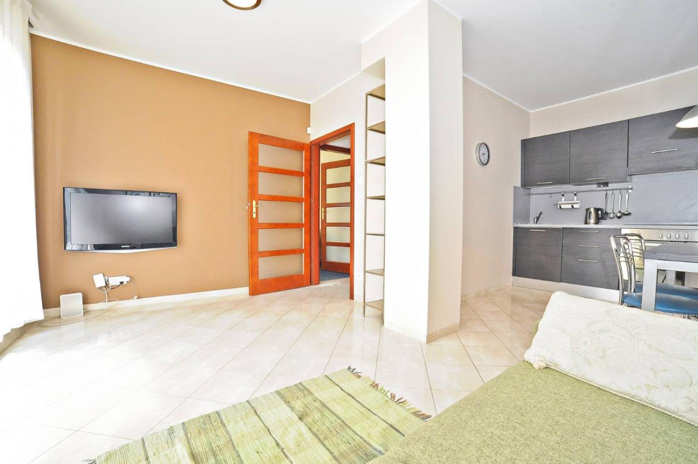 Apartament z tarasem. This apartment comprises 1 living room, 1 separate bedroom and 1 bathroom with a bath. Meals can be prepared in the well-fitted kitchen, which comes with a stovetop, a refrigerator, kitchenware and an oven. Featuring a terrace with garden views, this apartment also provides a washing machine and a flat-screen TV with cable channels. The unit offers 2 beds. Apartament - 5 osobowy. Powierzchnia pokoju ok.: 41 mkw.